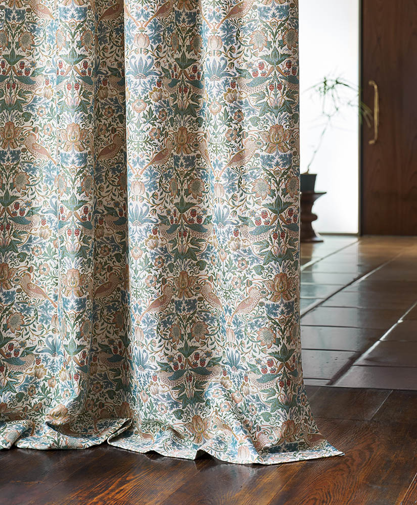 小鳥といちごをモチーフに、新色は繊細な色味と織りの奥行きが魅力。リビングや広めの窓を持つ部屋におすすめで、これまでのクラシカルで重厚なイメージから一新し、柔らかく優雅な雰囲気を演出します。色味が明るくなっている点を活かして、和モダンやミッドセンチュリーインテリアなどの幅広いスタイルにも組み合わせやすくなっています。