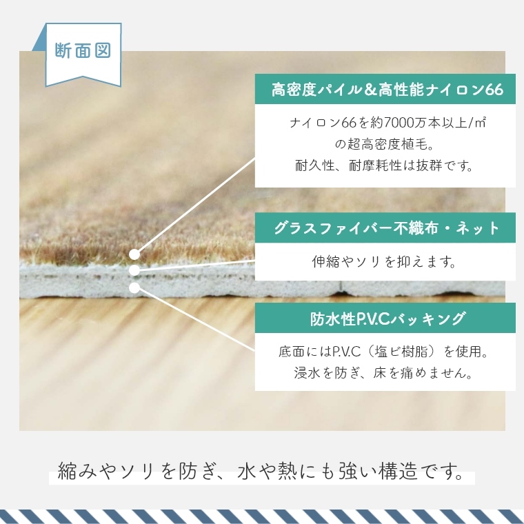 ★優れた耐久性:約7000万本/㎡という超高密度植毛により、重歩行にも耐えうる抜群の耐久性を実現しています。