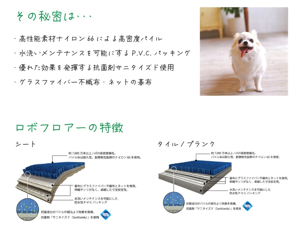 ロボフロアーは、クッション性や吸音性、耐久性に優れた第三の床材です。アスワン株式会社が製造しています。硬質床材(フローリングなど)と繊維床材(カーペットなど)の長所を組み合わせ、水洗いが可能で衛生的、抗菌機能や滑りにくさ、優れた遮音・吸音性を備えているのが特徴です。