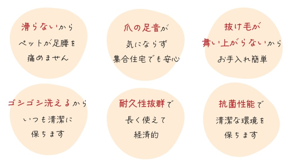 ロボフロアーは、フローリングとカーペットの“いいとこ取り”をした新しい床材です。超高密度構造による耐久性や水洗いできる衛生性、優れた防音・吸音性など、住まいに必要な機能をバランスよく備えています。足腰にやさしく滑りにくいため、小さなお子さまや高齢の方、ペットのいるご家庭にも最適。暖かく快適な住環境をつくる、これからの暮らしに寄り添う床材といえます。
